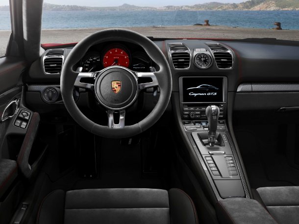 Wie beim Boxster ist auch beim Cayman GTS der Innenraum überwiegend in schwarzem Leder und Alcantara ausgeschlagen. Dazu gibt es rote Kontrastnähte.