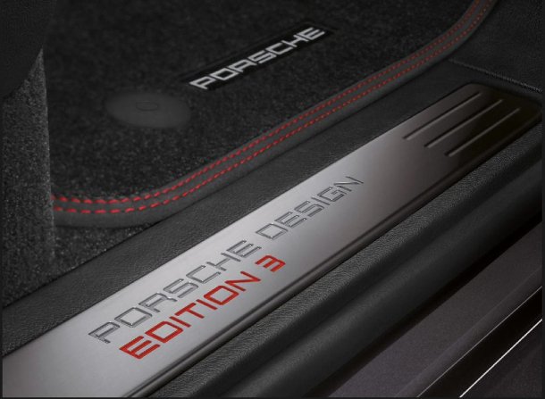 Im exklusiven Innenraum fällt einen sofort das schwarze Leder mit den roten Kontrastnähten ins Auge. Die Sitzbahnen sind jeweils mit rutschfestem Alcantara bezogen. Alcantara ziert auch den kompletten Dachhimmel, sowie Teile der Mittelkonsole, Türverkleidungen und Türgriffe. Auch im Innenraum macht Porsche kein Geheimnis daraus, daß es sich hier um eine limitierte Sonderserie handelt. „Porsche Design Edition 3“ Schriftzüge zieren sowohl den Drehzahlmesser, als auch die vorderen Einstiegsblenden. Auf dem Handschuhfach befindet sich eine Plakette mit eingeprägter, laufender Kleinseriennummer.