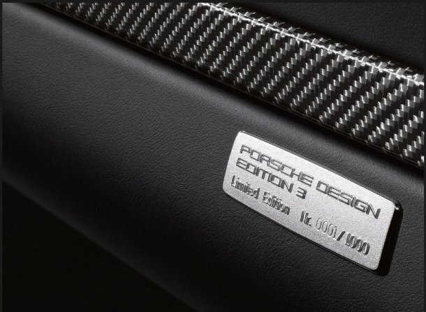 Im exklusiven Innenraum fällt einen sofort das schwarze Leder mit den roten Kontrastnähten ins Auge. Die Sitzbahnen sind jeweils mit rutschfestem Alcantara bezogen. Alcantara ziert auch den kompletten Dachhimmel, sowie Teile der Mittelkonsole, Türverkleidungen und Türgriffe. Auch im Innenraum macht Porsche kein Geheimnis daraus, daß es sich hier um eine limitierte Sonderserie handelt. „Porsche Design Edition 3“ Schriftzüge zieren sowohl den Drehzahlmesser, als auch die vorderen Einstiegsblenden. Auf dem Handschuhfach befindet sich eine Plakette mit eingeprägter, laufender Kleinseriennummer.