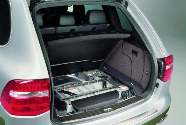 Nur drei Dinge unterscheiden den Cayenne S Hybrid von einem normalen Cayenne. Zum einen das große, mittige Infodisplay, welches alle wichtigen Informationen zum Antrieb anzeigt und zum anderen die Tatsache, dass die Drehzahlmessernadel auf Null geht, beim Gaswegnehmen. Die 63 cm breite Nickel-Metallhydrid-Batterie verschwindet zwar in der Reserveradmulde, sorgt abe dafür, dass der Boden des Kofferraums leicht erhöht ist.