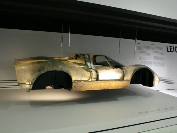 Zum Thema „Leicht“ zeigt man nämlich nicht nur eine Kurbelwelle oder den berühmten Balsaholz-Schaltknauf des 917, sondern auch eine Rohkarosserie des 908 Coupé, die dank Kunststoffbauweise nur 130 Kilogramm auf die Waage bringt und so dünn ist, dass man die innen angebrachten Leuchten deutlich sehen kann.