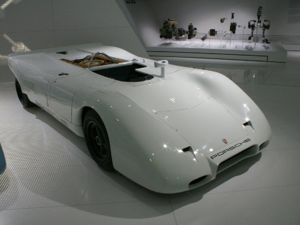 Ein absolutes Leichtgewicht steht mit dem 909 Bergspyder vor uns. Der Legende nach ließ sich Ferry Porsche den fertig gebauten 909 demontieren und ging mit einem Stabmagneten über die ausgebreiteten Teile. Alles, was angezogen wurde, musste neu entwickelt werden, weil es zu schwer seie. Das Endergebnis ist erst auf den zweiten Blick zu glauben: Bremsscheiben aus Beryllium, Kunststoffkarosserie und Alurahmen drücken das Gesamtgewicht auf nur 384 Kilogramm, die von 275 PS in Marsch gehalten werden.