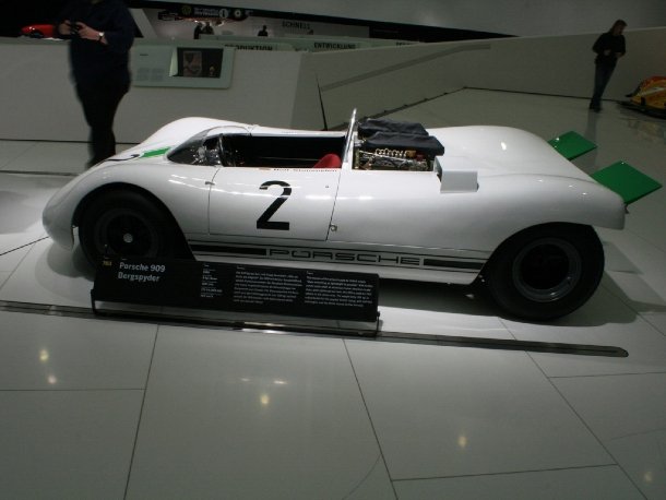 Ein absolutes Leichtgewicht steht mit dem 909 Bergspyder vor uns. Der Legende nach ließ sich Ferry Porsche den fertig gebauten 909 demontieren und ging mit einem Stabmagneten über die ausgebreiteten Teile. Alles, was angezogen wurde, musste neu entwickelt werden, weil es zu schwer seie. Das Endergebnis ist erst auf den zweiten Blick zu glauben: Bremsscheiben aus Beryllium, Kunststoffkarosserie und Alurahmen drücken das Gesamtgewicht auf nur 384 Kilogramm, die von 275 PS in Marsch gehalten werden.