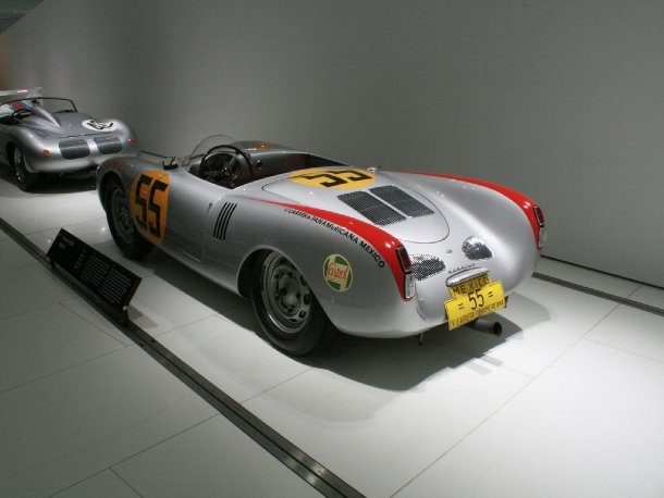 Der 550 Spyder war der erste Porsche speziell für den Rennsport. Mit seinem 110 PS starken Mittelmotor erringt er 1954 bei der Carrera Panamericana einen Klassensieg und wird Dritter insgesamt. Von diesem berühmten Straßenrennen übernahm Porsche den Titel für besonders leistungsstarke Serienwagen: Carrera. Der 550 ist auch das erste Fahrzeug, auf dem Sponsorenaufkleber auf der Rennstrecke auftauchten.