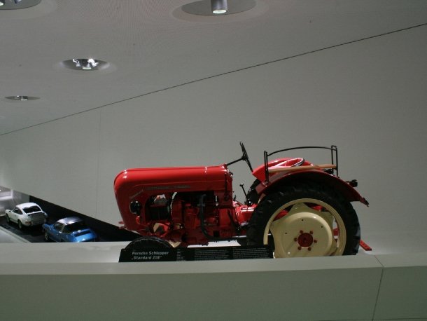 Zum Abschluss des Rundganges kann man noch einen Blick auf Porsche-Fahrzeuge werfen, die vorher nicht so recht in die Ahnengalerie gepasst hätten. Sowohl der mittlerweile bei Sammlern gesuchte Ackerschlepper – der erste Porsche Diesel, weit vor’m Cayenne – als auch der 914/4 „Volks-Porsche“ sind hier zu sehen.