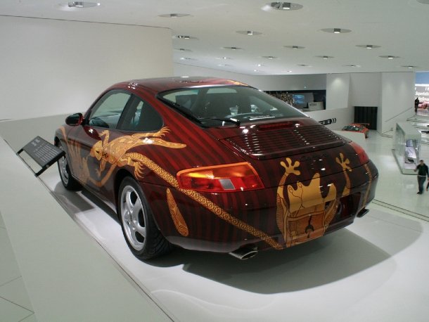 Biggibilla. Gesundheit. Nein, Biggibilla ist ein australischer Künstler und hat das letzte Exponat der Ausstellung, einen dunkelroten 996, mit traditioneller Malerei im Stile der Aborigines verschönert.