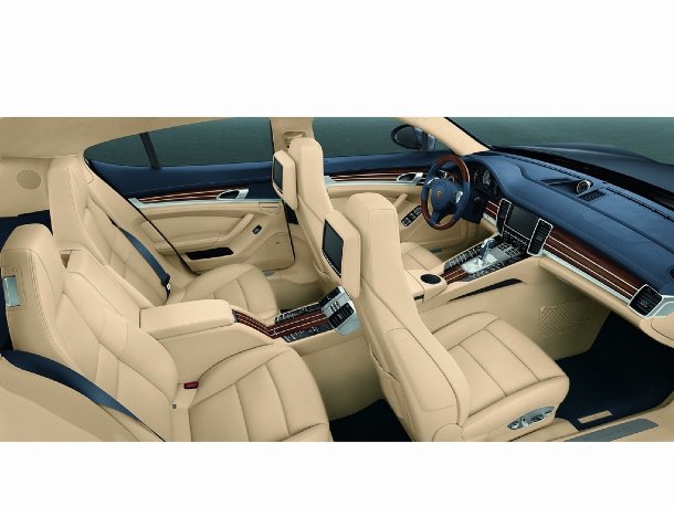 Auch für die Passagiere im Fond ist ein umfangreiches Programm vorhanden. Mit dabei sind zwei Trinkgläser im individuellen Porsche-Design. So lässt sich ein 10,5 Liter großes Kühlfach ordern, das zwischen den beiden Sitzen angebracht wird. Auch ein Rear-Seat-Entertainment-System mit zwei in die Rückenlehnen der Frontsitze integrierten, schwenkbaren Touchscreen-7-Zoll-Monitoren, USB-Schnittstellen, DVD- und CD-Abspielgerät und AV-Anschlüssen für Spielkonsolen oder iPod.