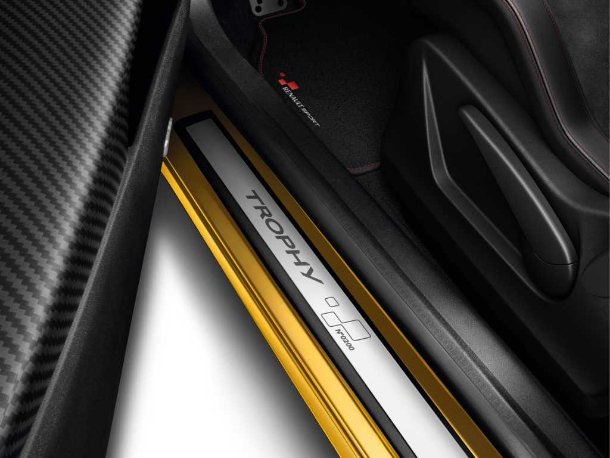 Optisch setzt sich das Sondermodell durch Akzente in Platingrau vom normalen RS ab. So zeigt sich beispielsweise die geschwungene Blende im unteren Lufteinlass der Frontschürze in diesem Farbton und mit zusätzlichem „Trophy“-Schriftzug. Auch das stilisierte Zielflaggendesign am unteren Ende der Türen und die großen Trophy-Decals im hinteren Seitenbereich sind in Platingrau foliert.
