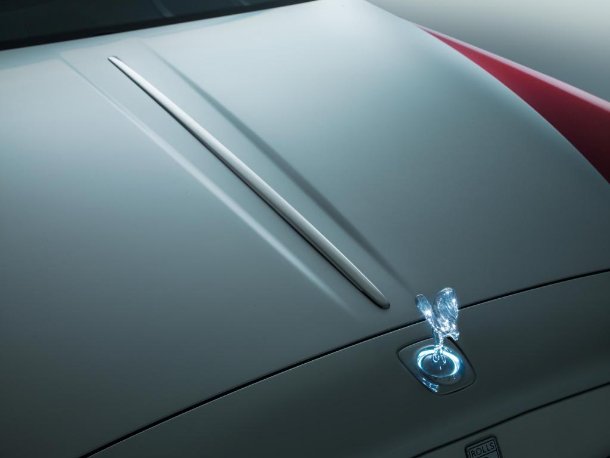 Sehr schnell entdeckt man als Kenner die neu geformten Scheinwerfer, die nun analog zum Phantom Serie II mit Full-LED-Technik arbeiten. Doch auch der komplette Kotflügel, in dem die Leuchte integriert ist, wurde umgestaltet und im oberen Bereich deutlicher konturiert. Zudem sind die Scheinwerfer selbst ein wenig nach außen gewandert, wodurch im Zusammenspiel mit der neuen Frontschürze der Eindruck eines breiteren, sportlicheren Fahrzeugs vermittelt wird. Auch die Motorhaube erhielt eine Modellpflege und trägt nun eine Vertiefung, die von der berühmten „Spirit of Ecstasy“ nach hinten bis zur Windschutzscheibe verläuft. Dies soll den Streifen eines Flugzeugs oder die Wellenbewegung hinter einer schnell fahrenden Yacht darstellen und somit die Dynamik des Rolls-Royce Ghost Serie II untermalen.