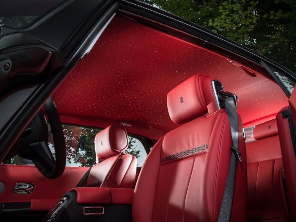 Das Interieur zeigt sich in knalligem Rot in Kombination mit wenigen schwarzen Elementen und dem beliebten LED-Sternenhimmel.