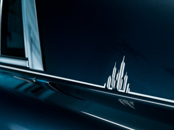 Im Interieur findet sich hochwertiges weiches Leder im speziell komponierten Farbton „Aetherius Grey“ auf Türtafeln, Sitzen und dem Armaturenbrett. Die Oberseite des Armaturenbretts ist mit schwarzem Leder bezogen, um Reflektionen in der Windschutzscheibe zu minimieren. In die Sitzlehnen jedes Platzes wird mit einer speziellen Technik und je 6.800 Nadelstichen ebenfalls ein Wolkenkratzer-Motiv gestickt. Beeindruckender sind indes insgesamt fünf Metropolen-Motive, die das Armaturenbrett auf der Beifahrerseite und die ausklappbaren Tische im Fond auf Ober- und Unterseite schmücken.