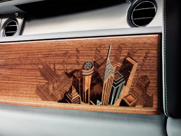 Aus jeweils über 500 Holz-Einzelteilen wurden hier Bilder zusammengesetzt, die den Blick auf eine Wolkenkratzer-Skyline nachempfinden. Am Armaturenbrett und auf der ausgeklappten Oberseite der Picknicktische ist es dabei der Ausblick wie aus einem Helikopter während die Unterseite der Klapptische die Ansicht nachbildet, die man auch aus den Fenstern des Phantom haben könnte. Die Holzexperten in der Bespoke-Abteilung benötigen pro Motiv mehrere Tage, um jedes Holzstück einzeln in Form zu schleifen, zu polieren und auf Farbübereinstimmungen zu kontrollieren. Kleine Fehler im Holz wie Knötchen oder Flecken führen zum Austausch.