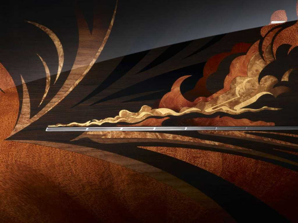 Das Motiv in den Intarsien entpuppt sich als Dampfschnellzug, der durch die Landschaft fährt. Ein Symbol für die Lust am Reisen.