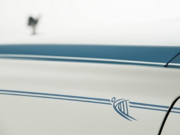 Dieser Flugapparat wurde von Rolls-Royce mittels eines Logos dargestellt, das sich wie erwähnt auf den Kopfstützen findet. Zusätzlich wird es per Hand auf den vorderen Kotflügeln aufgemalt. Es erinnert nicht nur an Abbas Ibn Firnas, sondern von der Form her auch ein wenig an die Spirit of Ecstacy, die bekanntlich als Kühlerfigur jeden Rolls-Royce begleitet. Im unteren Bereich der D-Säulen findet sich der ebenfalls handgemalte Schriftzug „فرناس“, was die arabischen Zeichen für „Firnas“ sind. In die Holzverkleidung des Armaturenbretts ist das Firnas Logo unter dem Klarlack eingelegt worden und auch die Einstiegsleisten zeigen das Firnas Motiv nebst der Beschriftung „Firnas motif – one of five“.
