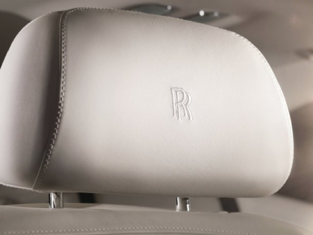 Weißes Leder in bester Qualität schmeichelt Augen, Tast- und Geruchssinn im Interieur. Dazu laden Ziernähte und das eingestickte Rolls-Royce-Logo auch den Tastsinn zur Arbeit ein.