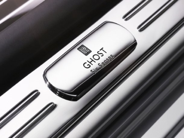 Auf einer Plakette auf den Einstiegsleisten wird der Name des Ausstellungsfahrzeugs angegeben: Ghost Six Senses.