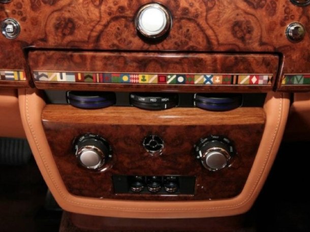 Auf Sitzen und Armaturenbrett empfängt die Besatzung Leder in einem warmen Braun. Dieses wird am Lenkrad und auf der Mittelkonsole durch einen etwas dunkleren Ton geschickt akzentuiert und passt bestens zu den edlen Hölzern im Armaturenbrett und den Lenkradspeichen. Im unteren Bereich des Instrumententrägers ist als Intarsie ein farbiges Band eingelegt, das sich bei genauerer Betrachtung als etwas Besonderes herausstellt: Es stellt alle 35 Rennfarben der siegreichen Jockeys des diesjährigen Goodwood Pferderennens auf dem Gelände von Lord March in West Sussex. In direkter Nachbarschaft befindet sich der Stammsitz von Rolls-Royce.