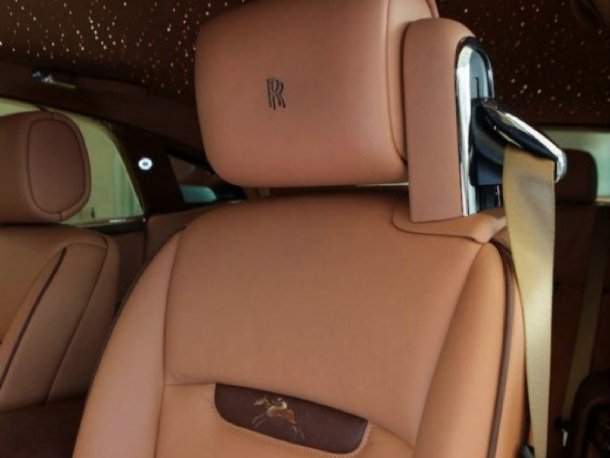 Auf Sitzen und Armaturenbrett empfängt die Besatzung Leder in einem warmen Braun. Dieses wird am Lenkrad und auf der Mittelkonsole durch einen etwas dunkleren Ton geschickt akzentuiert und passt bestens zu den edlen Hölzern im Armaturenbrett und den Lenkradspeichen. Im unteren Bereich des Instrumententrägers ist als Intarsie ein farbiges Band eingelegt, das sich bei genauerer Betrachtung als etwas Besonderes herausstellt: Es stellt alle 35 Rennfarben der siegreichen Jockeys des diesjährigen Goodwood Pferderennens auf dem Gelände von Lord March in West Sussex. In direkter Nachbarschaft befindet sich der Stammsitz von Rolls-Royce.