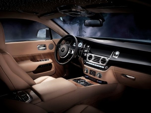 Die vorne an der A-Säule öffnende „Coach Door“ mit Anschlag an der B-Säule gibt den Blick frei auf ein feudales Interieur, welches ohne Zweifel die absolute Spitze dessen markiert, was an hochwertiger Materialverwendung und -verarbeitung im Automobilbau heutzutage verfügbar ist. Speziell für den Wraith offerieren die Briten ein offenporiges Edelholz im Canadel Panelling Stil, angelehnt an die Einrichtung französischer Luxusjachten, ganz nach dem Geschmack von Sir Henry Royce himself. Natürlich ist auch für dieses Modell der Sternenhimmel mit 1340 Leuchtdioden erhältlich.