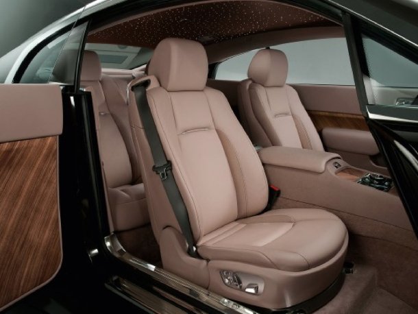 Die vorne an der A-Säule öffnende „Coach Door“ mit Anschlag an der B-Säule gibt den Blick frei auf ein feudales Interieur, welches ohne Zweifel die absolute Spitze dessen markiert, was an hochwertiger Materialverwendung und -verarbeitung im Automobilbau heutzutage verfügbar ist. Speziell für den Wraith offerieren die Briten ein offenporiges Edelholz im Canadel Panelling Stil, angelehnt an die Einrichtung französischer Luxusjachten, ganz nach dem Geschmack von Sir Henry Royce himself. Natürlich ist auch für dieses Modell der Sternenhimmel mit 1340 Leuchtdioden erhältlich.
