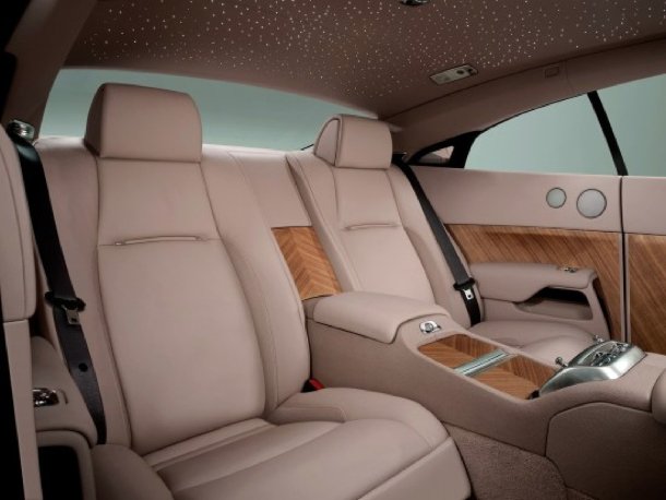 Die vorne an der A-Säule öffnende „Coach Door“ mit Anschlag an der B-Säule gibt den Blick frei auf ein feudales Interieur, welches ohne Zweifel die absolute Spitze dessen markiert, was an hochwertiger Materialverwendung und -verarbeitung im Automobilbau heutzutage verfügbar ist. Speziell für den Wraith offerieren die Briten ein offenporiges Edelholz im Canadel Panelling Stil, angelehnt an die Einrichtung französischer Luxusjachten, ganz nach dem Geschmack von Sir Henry Royce himself. Natürlich ist auch für dieses Modell der Sternenhimmel mit 1340 Leuchtdioden erhältlich.