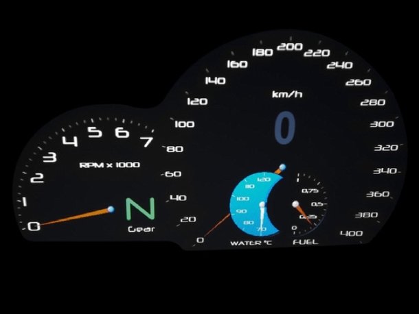 Der Tacho reicht bis 400 km/h und macht damit den Anspruch von GTA klar. Es handelt sich um einen LCD-Bildschirm, auf dem sich alle wichtigen Infos einblenden lassen.