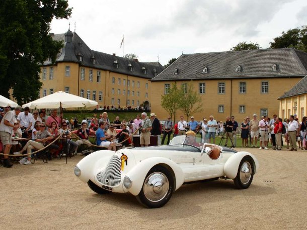 Der Mercedes-Benz-Auftritt war dieses Jahr vor allem vom Thema Weltrekorde und Motorsport geprägt. Neben einem C111 fand auch der 190E 2.3-16 von den Rekordfahrten aus Nardo den Weg ans Schloss. Volkswagen nutzte die Gelegenheit diverse Rallye-Gölfe und einen Renn-Scirocco auf dem Rundkurs zu zeigen. Vor dem VW Zelt standen dann so spektakuläre Stücke wie der Golf GTI W12 650 und der Vision GTI. Porsche nutzte die Gelegenheit den Typ 64 ans Schloss zu bringen, der bereits vor zwei Wochen auch schon am Schloss Bensberg zu sehen war. Auch die Golf Rallye Fahrzeuge waren bereits in Bensberg zu sehen, allerdings deutlich langweiliger, weil sie dort eben nur herumstanden und nicht standesgemäß flott um den Rundkurs bewegt wurden. Auch die Fiat Group ließ sich nicht lumpen und brachte den spektakulären Lancia 037 ans Schloss, der mit seinem infernalischen Sound die Massen begeisterte. Flankiert wurde der 037 Rallye unter anderem von einem ebenso legendären Lancia D50 Formel 1 Rennwagen.