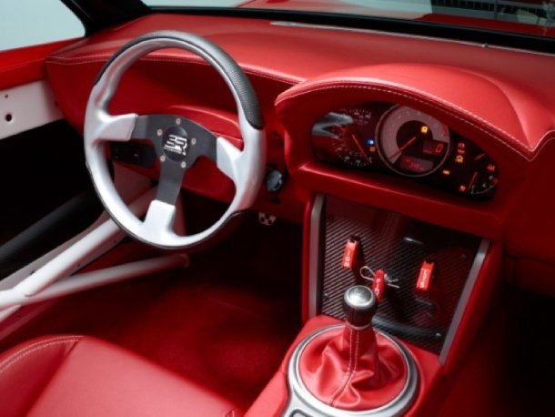 Speziell innen wird die Nähe zum Motorsport deutlich. Anstelle der bekannten Instrumenteneinheit hinter dem Lenkrad erhielt der FR-S Cartel Speedster ein spartanisches Armaturenbrett mit zentral angeordnetem Display über der Mittelkonsole. Diese ist auch stark reduziert worden und besteht aus lediglich drei Kippschaltern auf einer Carbonoberfläche. Ein Überrollkäfig sorgt für zusätzliche Steifigkeit und zeigt sich, ebenso wie viele Elemente des Interieurs, in nacktem weiß lackiertem Metall. Dazu gibt es rotes Leder auf Sitzen und Armaturenbrett und ein kleines, griffiges Sportlenkrad.