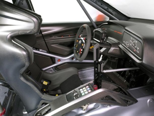Innen wird die notwendige Gewichtserleichterung für den Motorsport ersichtlich. Jegliche Art von Dämmung entfällt ebenso wie die Rückbank und der Beifahrerplatz. Lediglich ein Carbon-Schalensitz mit HANS-Aufnahme findet sich hinter dem spartanischen Sportlenkrad. Dahinter findet sich ein Multifunktionsdisplay für Tempo, Drehzahl und weitere Informationen. Auf dem Mitteltunnel ist bei der Rundstreckenvariante ein Carbongestell mit Knöpfen für die wichtigsten Funktionen vorgesehen. Auch das Armaturenbrett wird durch ein formgleiches Teil aus Kohlefaser getauscht, auf dem unter anderem eine Abbildung der zu fahrenden Rennstrecke angebracht werden kann. Selbstverständlich sorgt ein vollwertiger FIA-Überrollkäfig für Steifigkeit und Sicherheit.