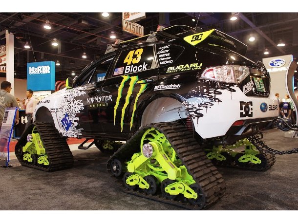 Wenn Papa schon einen flammenden Hot Rod fährt, will Sohnemann sowas meist auch haben. Wenn der Junior aber noch zu klein ist, um selbst Auto zu fahren, hilft nur „Pimp my Toys“. Anders lässt es sich wohl nicht erklären, dass auf der SEMA sogar getunte und mit Airbrush verzierte Dreiräder zu sehen waren. Ken Block und sein Rallye Subaru waren auch da, letzterer auf Kettenantrieb umgebaut. Auch sowas sieht man wohl nur in Las Vegas auf der SEMA.