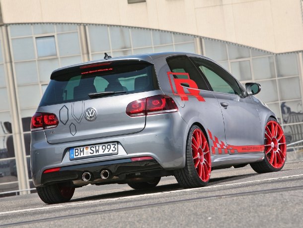 Damit der Golf R vor lauter Kraft nicht den gesunden Kontakt zum Asphalt verliert, wird von Sport-Wheels ein stufenlos in Zug- und Druckstufe verstellbares Sportfahrwerk mit Tieferlegung verbaut. Für die Bodenhaftung sorgen 235/30er Reifen auf 20 Zoll großen Leichtmetallrädern, die zusammen 12 Kilogramm leichter sind, als die Serienfelgen. Angeboten werden die Räder wahlweise in silber, mattschwarz oder mit roten Speichen und Frontfinish in jeweiliger Wagenfarbe.
