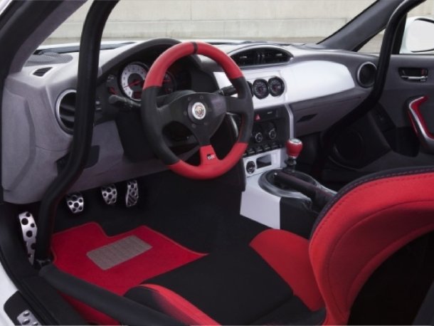 Auch das Interieur präsentiert sich motorsportlich mit einem vollwertigen Überrollkäfig, Schalensitzen und Vierpunktgurten. Das Armaturenbrett ist mit grauem Alcantara bezogen und zeigt Dekorblenden in Wagenfarbe. In der Mittelkonsole sind Anzeigen für die Wasser- und Öltemperatur und den Ladedruck untergebracht worden. Um Platz für den Überrollkäfig zu schaffen entfiel die hintere Sitzbank beim GT86 Sports FR Concept. Die Sitze und das Lenkrad sind in schwarz und rot gehalten.