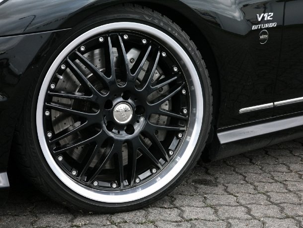 Die Bremsanlage wird mittels Stahlflexleitungen und Rennbremsöl, sowie Familien-Pizza großen Bremsscheiben (405 Millimeter Durchmesser) und Sechskolben-Bremssätteln an die Mehrleistung angepasst. Auch für das serienmäßige Airmatic-Fahrwerk bietet Väth eine Kur an, die das Auto 40 Millimeter näher an die Straße holt.