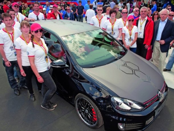 Für den zweiten Teil verarbeiteten die neun Auszubildenden im Innenraum Alcantara und Leder in schwarz und rot und versahen die Bauteile mit roten Ziernähten. In die Türverkleidungen wurden Dekorblenden mit handlackiertem GTI-Schriftzug eingearbeitet. Passend zum GTI Treffen gibt es eine Musikanlage mit neun Lautsprechern und 1.800 Watt Spitzenleistung, deren Hauptkomponenten unter einer Plexiglasplatte im Kofferraum verstaut sind. Der Golf GTI Black Dynamic wird, trotz aller Furore, die er auf dem GTI Treffen am Wörthersee auslöst, wohl ein Einzelstück bleiben und als solches ins VW Museum rollen. Für die neun beteiligten Azubis ist es dennoch das absolute Highlight ihrer Ausbildung und ein wichtiger Punkt in ihrem Lebenslauf.