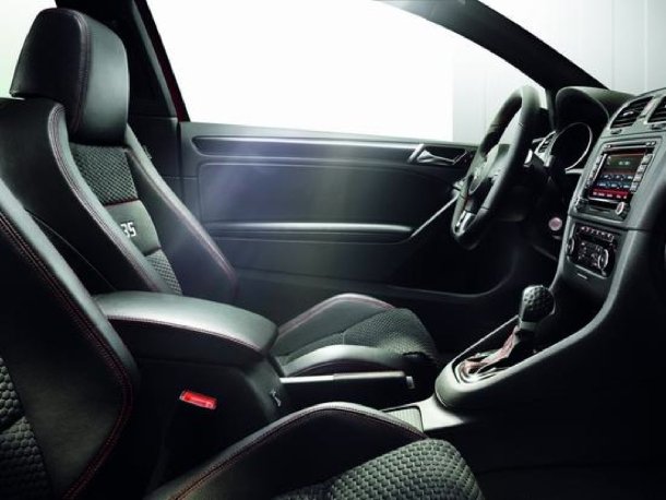 Die Sitzer erhalten rote Kontrastnähte außen und die "35" in der Mittelbahn. Auf dem Schalthebel sitzt ein Golfball, der an den Ur-GTI erinnern soll.