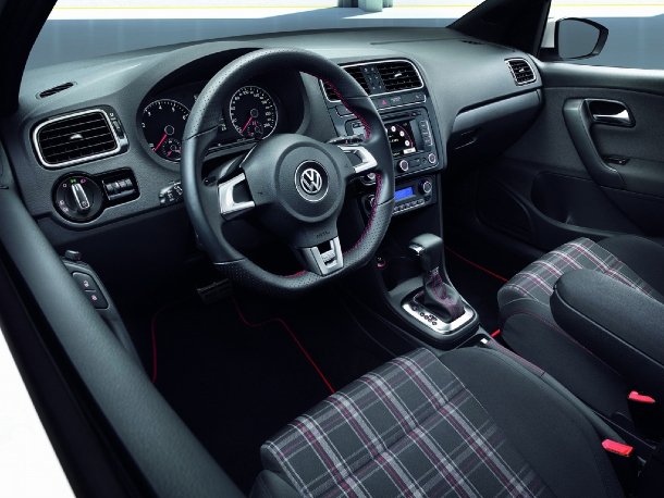 Im Innenraum rezitiert der Polo aus der erfolgreichen GTI-Historie. So finden sich Sportsitze im typischen Karo-Muster, das bereits den ersten Golf GTI schmückte. Haltegriffe, Sonnenblenden, Dachhimmel und die Verkleidungen der Dachsäulen sind sportlich schwarz gehalten. Ebenso wurde eine schwarze Oberflächenveredelung für die Zierblenden der Mittelkonsole verwendet. Alle Chromapplikationen sind mattiert, ob an der DSG-Kulisse, den Luftdüsen oder am Sportlederlenkrad mit roter Ziernaht.