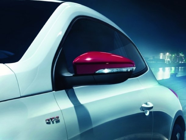 Die Außenspiegelkappen sind farblich an das Streifendekor angepasst worden.