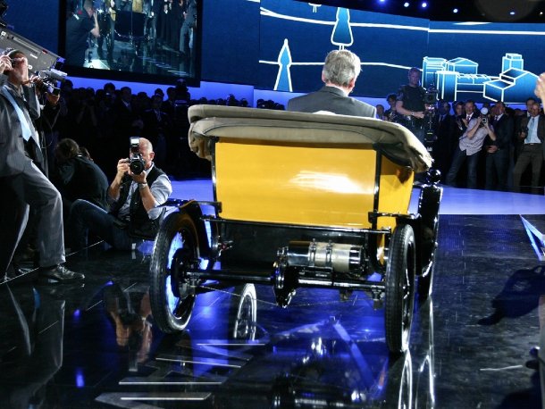 Zuerst kam Franz-Josef Paefgen aber mit einem historischen Bugatti mit Elektroantrieb auf die Bühne gerollt. Sechs Stück waren in den 1920er Jahren im Bugatti-Werk im Einsatz, um Ettore Bugatti geräusch- und emissionslos von einer Abteilung zur nächsten zu bringen. Mit der Vorstellung auf diesem Event wollte Bugatti die Brücke zur heutigen Zeit schlagen, denn auch Bugatti muss sich Gedanken um weniger CO²-Ausstoß und Verbrauch machen.