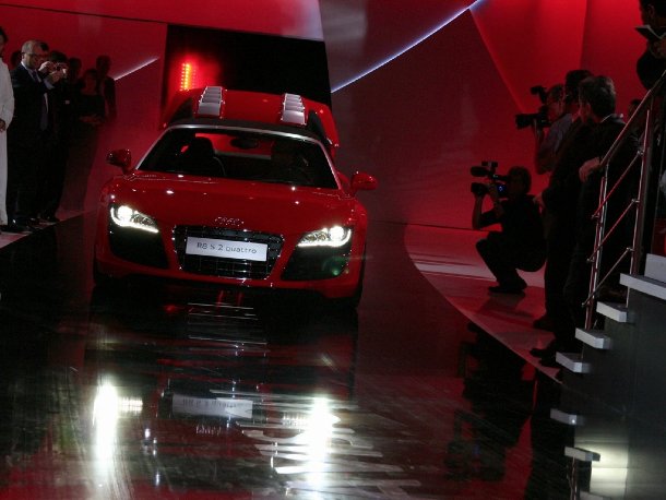 Der Audi R8 Spyder macht live eine sehr gute Figur und wird mit Sicherheit an die Verkaufserfolge seiner geschlossenen Brüder anschließen. Auf dem abendlichen Event präsentierte er sich in rot, am nächsten Tag auf dem Audi-Messestand in Halle 3.0 sollte er sich dann in weiß im Messelicht sonnen.