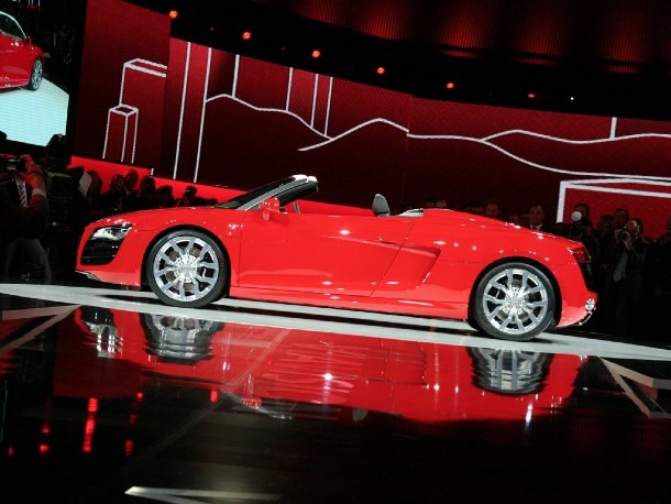 Rupert Stadler, Chef von Audi, rollte schließlich mit dem R8 Spyder herein und öffnete unterwegs das Verdeck. Ganz ehrlich? Offen gefällt uns der R8 besser als die Coupé-Version. Der Spyder ist übrigens nur als 5,2-Liter V10 erhältlich.