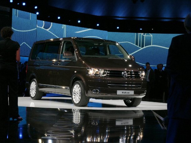 Anschließend rollte der Chef von Volkswagen Nutzfahrzeuge mit der neuesten Version des beliebten Multivans auf die Bühne. Neben der äußeren Auffrischung von Front und Heck wurde vor allem der Innenraum deutlich aufgewertet.