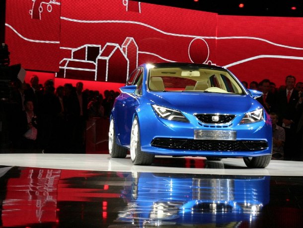 Seat zeigte das erste Konzeptfahrzeug des Abends, den IBZ Concept Frankfurt 2009. Hier wird jetzt schon die Linienführung des kommenden Ibiza Kombi gezeigt, der vermutlich kommendes Jahr in Genf stehen dürfte. Nachdem der IBZ vorgestellt wurde, präsentierte der neue Seat-Chef James Muir den Pokal der neu geschaffenen UEFA Europaliga und gab bekannt, dass Seat alleiniger Hauptsponsor geworden ist. Leider ließ sich das von meinem Standpunkt aus nur von einer der zahlreichen Leinwände abfotografieren.