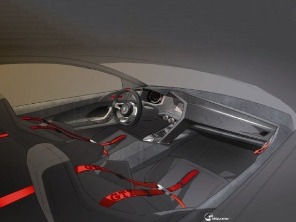 Die Farbgebung des Exterieurs in Club White mit Details in Klavierschwarz und den roten GTI-Akzenten wird im Interieur durch Alcantara in Anthrazit und Titanschwarz, sowie Leder in Schwarz und Flashrot ergänzt. An den Dekorblenden zeigt sich die sichtbare Struktur von Carbon und unterstützt damit das reduzierte Innenraumdesign, bei dem so wenig wie möglich Schalter verbaut wurden. Am Sportlenkrad sind auf der Rückseite die Schaltwippen des DSG-Getriebes angebracht und vorn lediglich der Start-Stopp-Knopf für den Motor und ein Drehregler für die Fahrmodi „Street“, „Sport“ und „Track“. Auf der Mittelkonsole gibt es lediglich Schalter für die Klimatisierung, die Warnblinkanlage, die Onboard-Kameras und die für den Motorsport wichtigen Schalter für die Trennung des Bordnetzes von der Batterie und die Feuerlöschanlage. Daneben glänzt lediglich noch ein kleiner Knopf zur ESP-Deaktivierung mit seiner Anwesenheit. Anstelle einer Rückbank gibt es einen X-förmigen Querträger des Überrollkäfigs mit integriertem Aufrollmechanismus für die roten Hosenträgergurte und einer Ablagemöglichkeit für zwei schwarze Integralhelme im unteren Bereich. Auch die Schlaufen zum öffnen der Türen sind in rot gehalten.