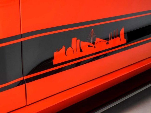 An den Türen des Golf GTI Wolfsburg Edition findet sich die Skyline der Produktionsstadt am Mittellandkanal. Alle wichtigen Bauwerke Wolfsburgs sind zu finden.