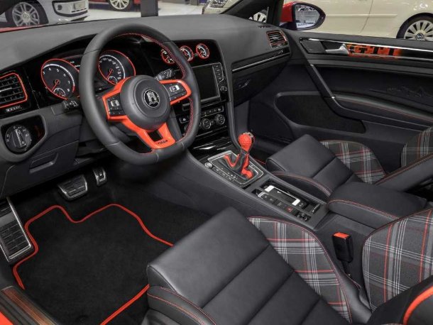 Innen setzt sich das rot-schwarze Farbspiel von außen weiter fort. Auf den Sitzen wird schwarzes Leder mit roten Streifen auf den Kopfstützen und Sitzwangen im typischen GTI-Karomuster kombiniert. Am mit schwarzem Leder bezogenen Sportlenkrad fallen die rot lackierten Speichen und die roten Ziernähte ins Auge. Mittels aufwendiger Spraytechnik wurden rot eingefasste GTI-Schriftzüge auf die schwarzen Dekorblenden der Türen aufgebracht. In die Lederpaneele darunter wurde die Wolfsburg-Skyline eingeprägt. In die handgefertigte Mittelkonsole wurde eine iPhone-Ladestation integriert.