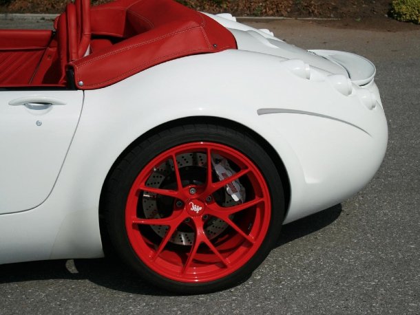 Betrachten wir den Kleinen einmal von außen. Dicke Backen und eine Farbkombination, die wohl nur die wenigsten Betrachter auf Anhieb gut finden. Weißer Lack von Ferrari, kombiniert mit rot lackierten Felgen und ebenso rotem Interieur. Muss man mögen, aber Wiesmann baut auf Wunsch ja bekanntlich Autos in jeder denkbaren Lackierung, somit muss man seinen Wagen ja nicht in dieser Kombination bestellen. Was haben wir hier genau vor uns? Eingeweihte werden es bereits erahnen, es ist das derzeitige Topmodell, der limitierte Wiesmann Roadster MF5.